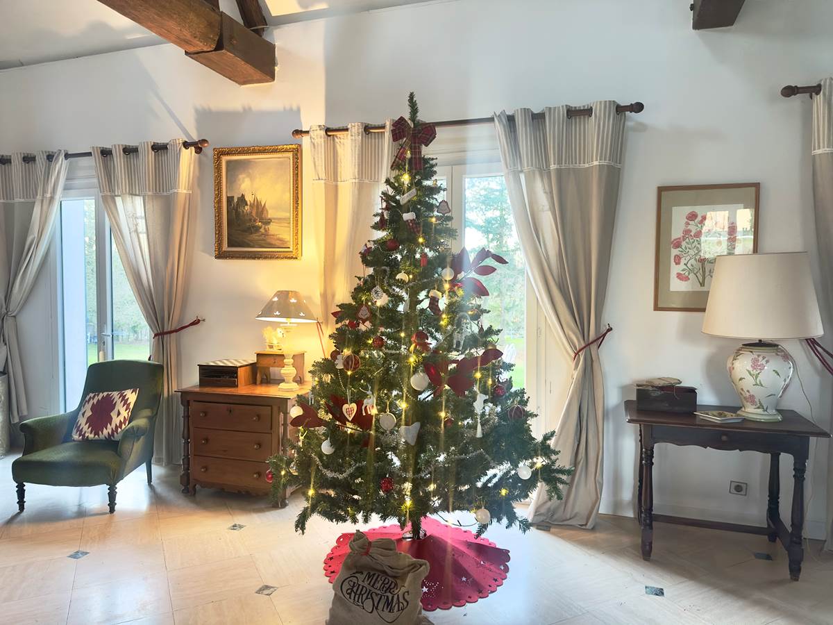 Le cœur de la maison est un salon cathédrale de 80 m², doté d'une poutraison du XVIᵉ siècle, d'une immense cheminée ouverte et d'un piano, le tout ouvrant directement sur le parc. À ses côtés, la grande salle à manger permet de réunir famille et amis dans une ambiance conviviale, propice aux longues soirées partagées.